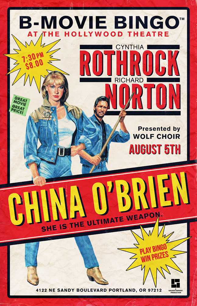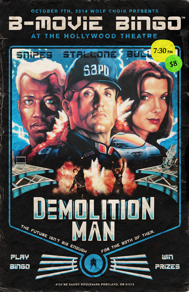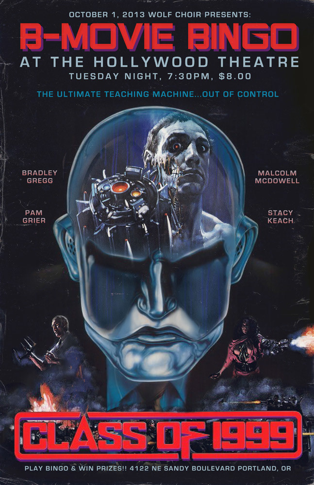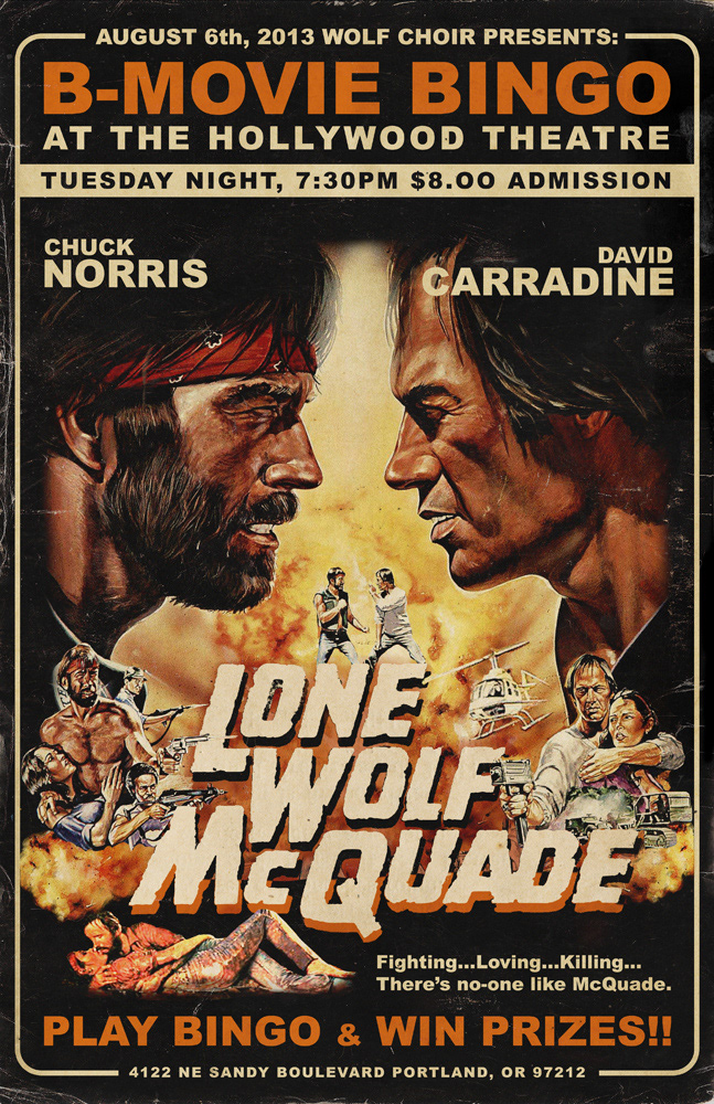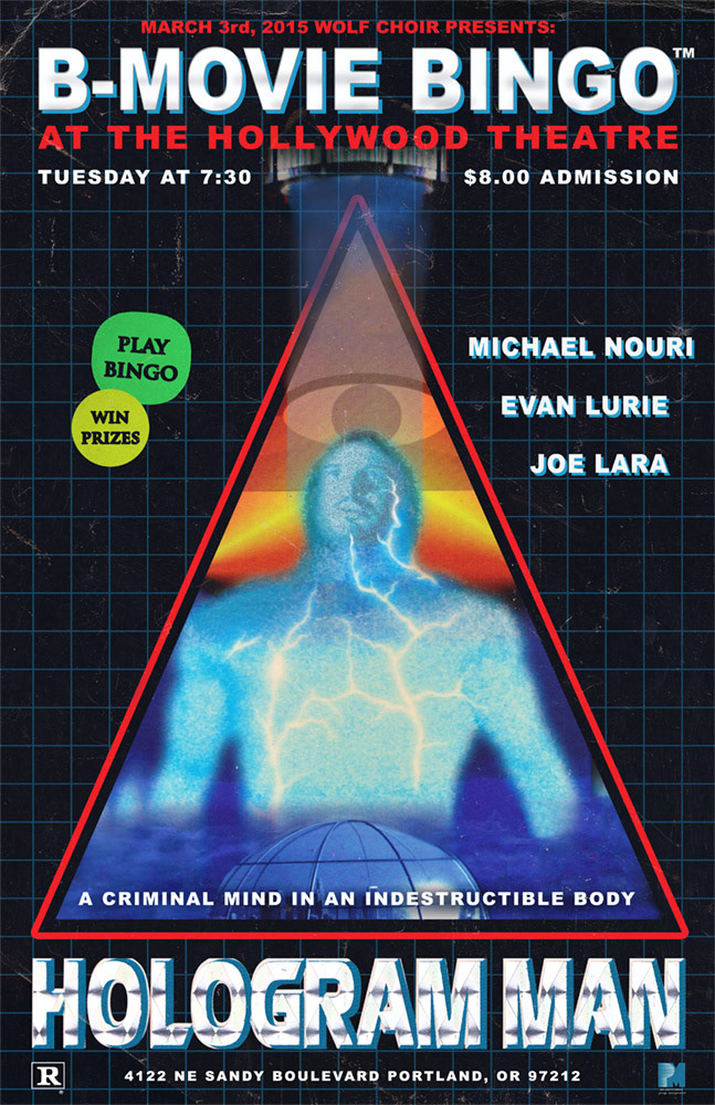 B-Movie Bingo is an event hosted by "Wolf Choir" (John Egan, Robbie Augspurger, Eric Dexter, and Aaron Shepherd) at Portland's Hollywood Theatre. My husband and I make the posters each month using old art from the movies, screen shots, and lots and lots of lasers.