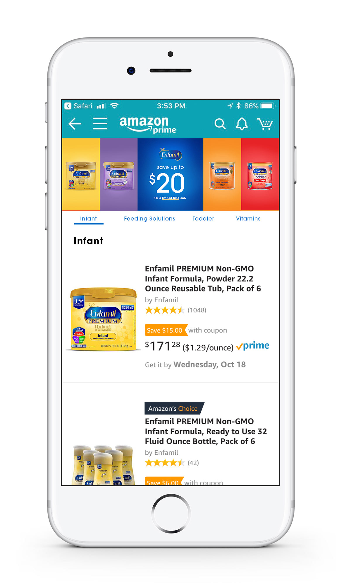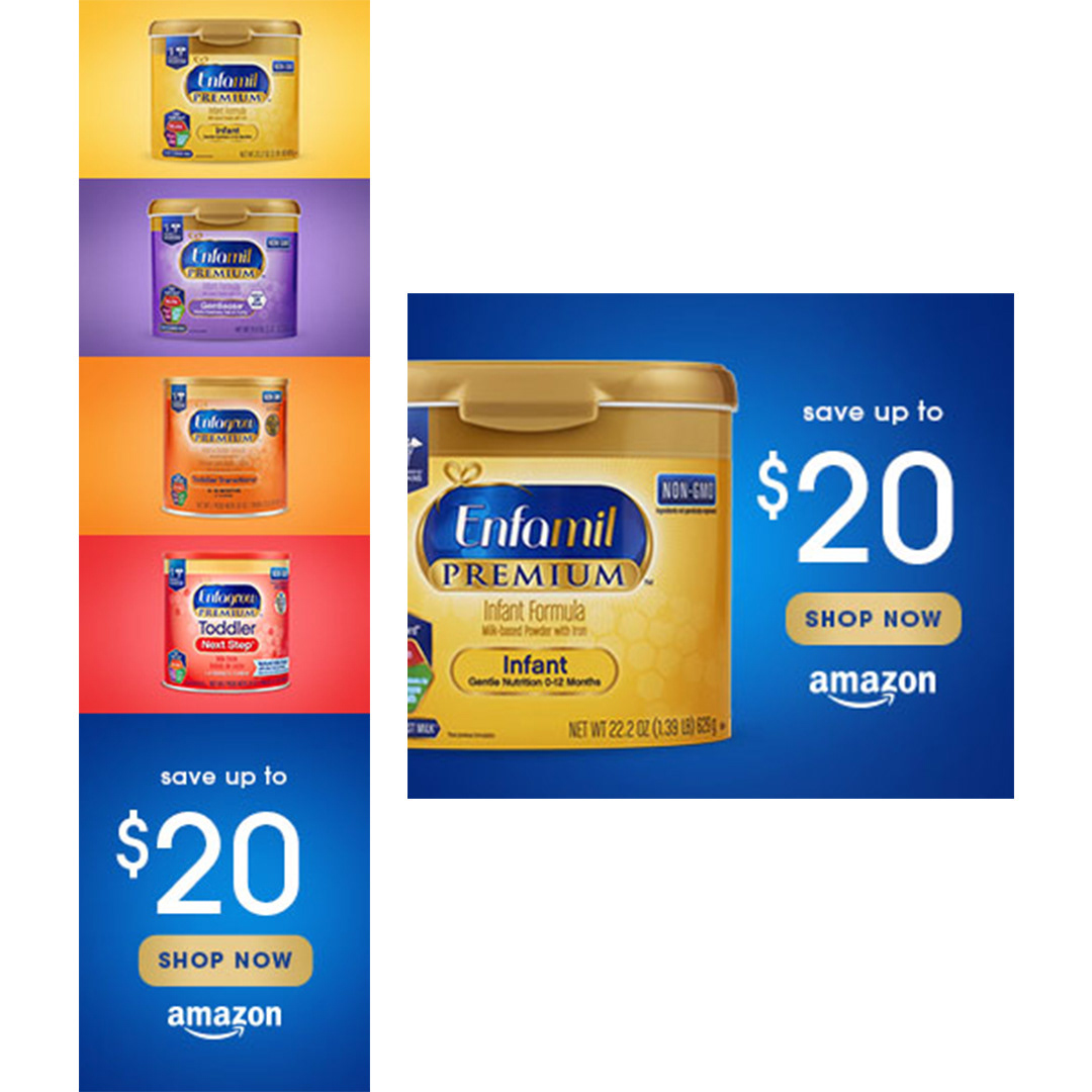 Amazon Media Group adamantly said single products on white backgrounds convert best in their environment. I challenged this by creating a series of ads that worked off an insight from Enfamil that “Mom shops by color”, meaning, she may not remember the name Gentlease, but she remembers she buys the purple Enfamil formula.