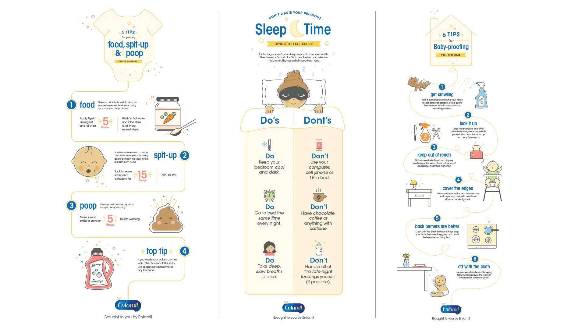 Enfamil tasked my team to create content that would re-engage Moms who had shown a decline in opening Enfamil’s emails. They also wanted content that would cross promote products in RB’s portfolio that support the idea “happy baby, happy mom, happy home”. Our strategy was to focus on new moms and create content that was genuinely helpful, while positioning Enfamil as a partner to Mom in her journey through baby’s first year infographics that contained helpful tips for mom.