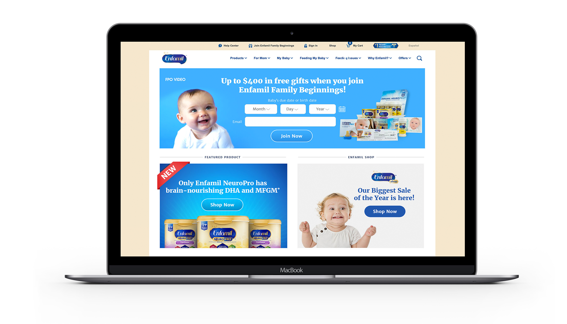 The Enfamil web team asked us to create a homepage they could test against their current page. We had to represent all areas currently on the site, but chose to streamline and simplify the way it was presented to create an easier user experience. In both concepts, the hero banners contain video to help visually engage the user.