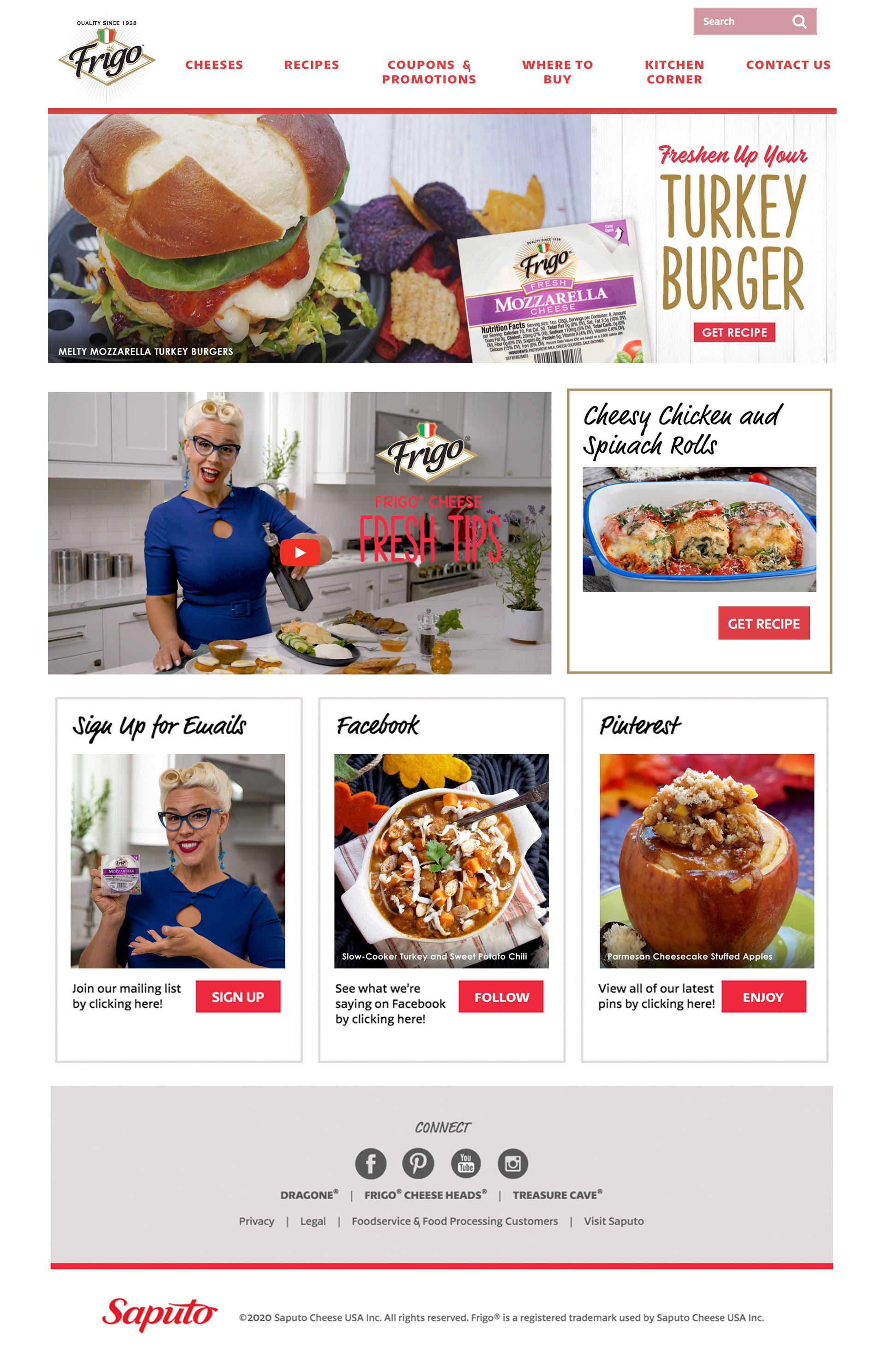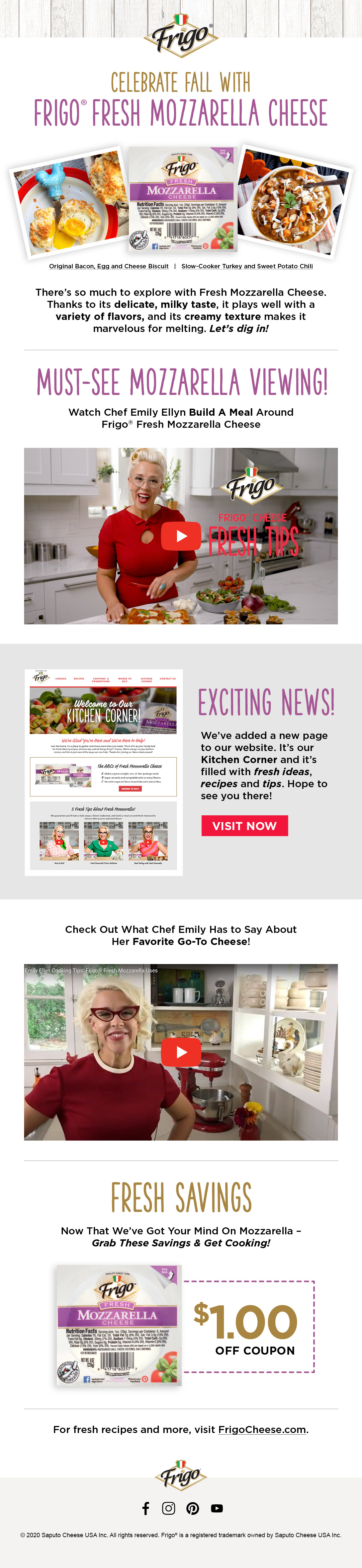We carried our promotion of fresh mozzarella throughout Frigo's website, as well as marketing emails and social media posts.
