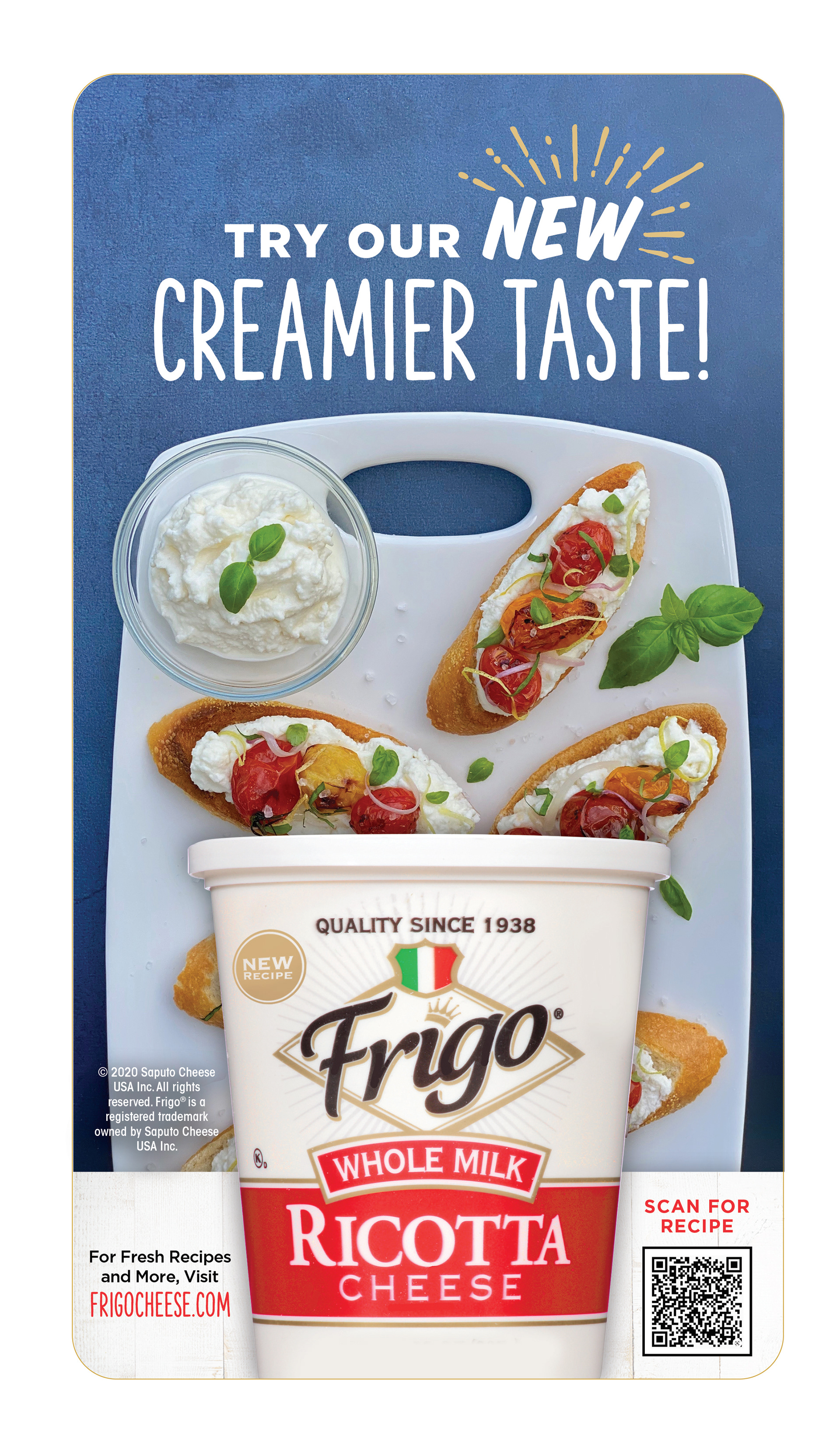 To announce FRIGO®'s new creamier ricotta recipe, we created a shelf talk to encourage purchase. We leaned on visually appealing photography, large packaging and a QR code to add a feature in which we could track interaction and effectiveness of the shelf talk.