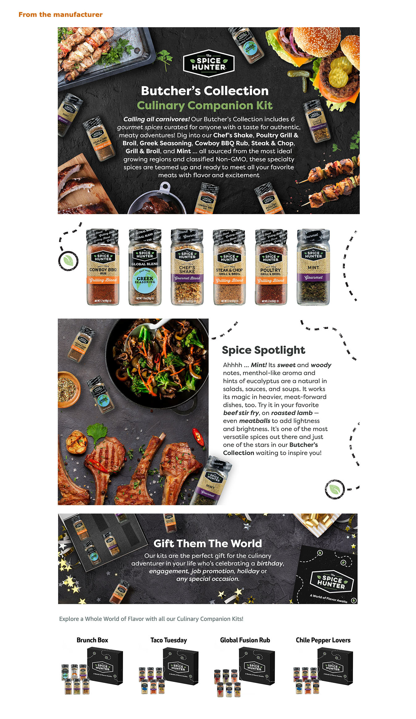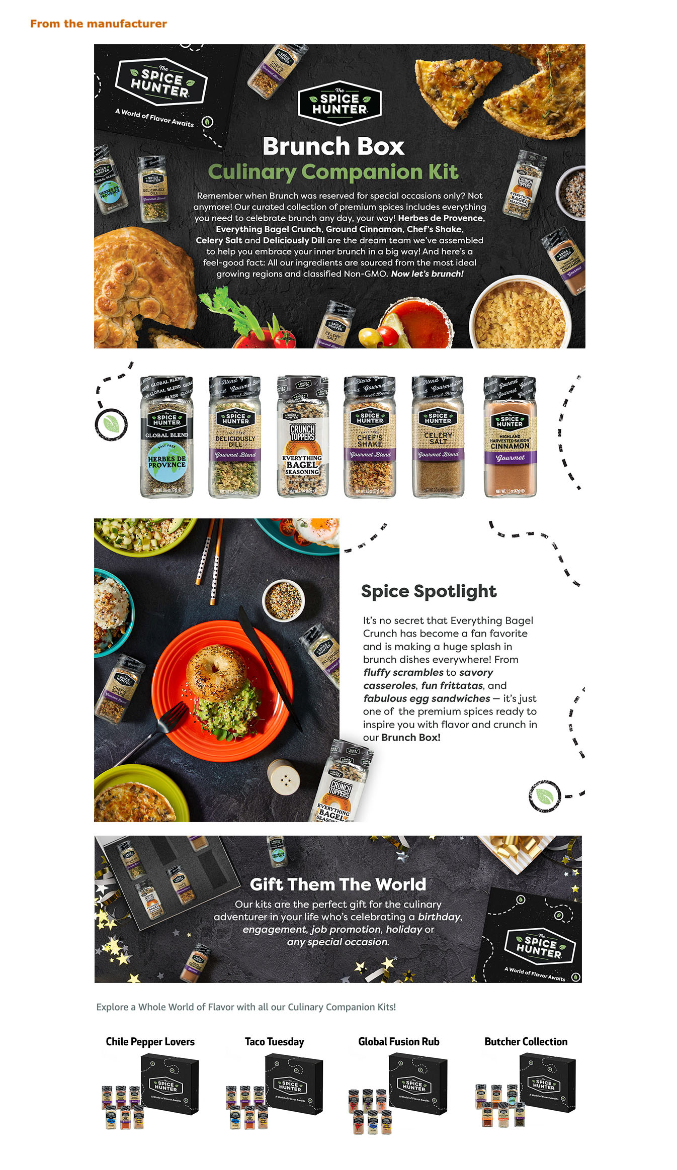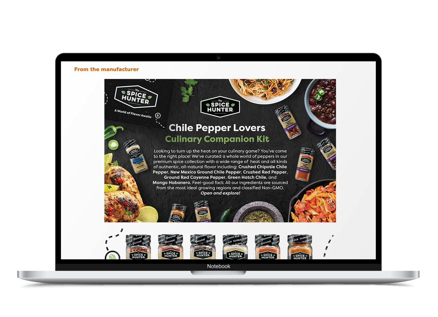 I was tasked to create Amazon "below the fold" content for The Spice Hunter's Culinary Companion Kits. Each page tells the taste story, gives recipe inspiration and helps customers feel confident in their purchase.